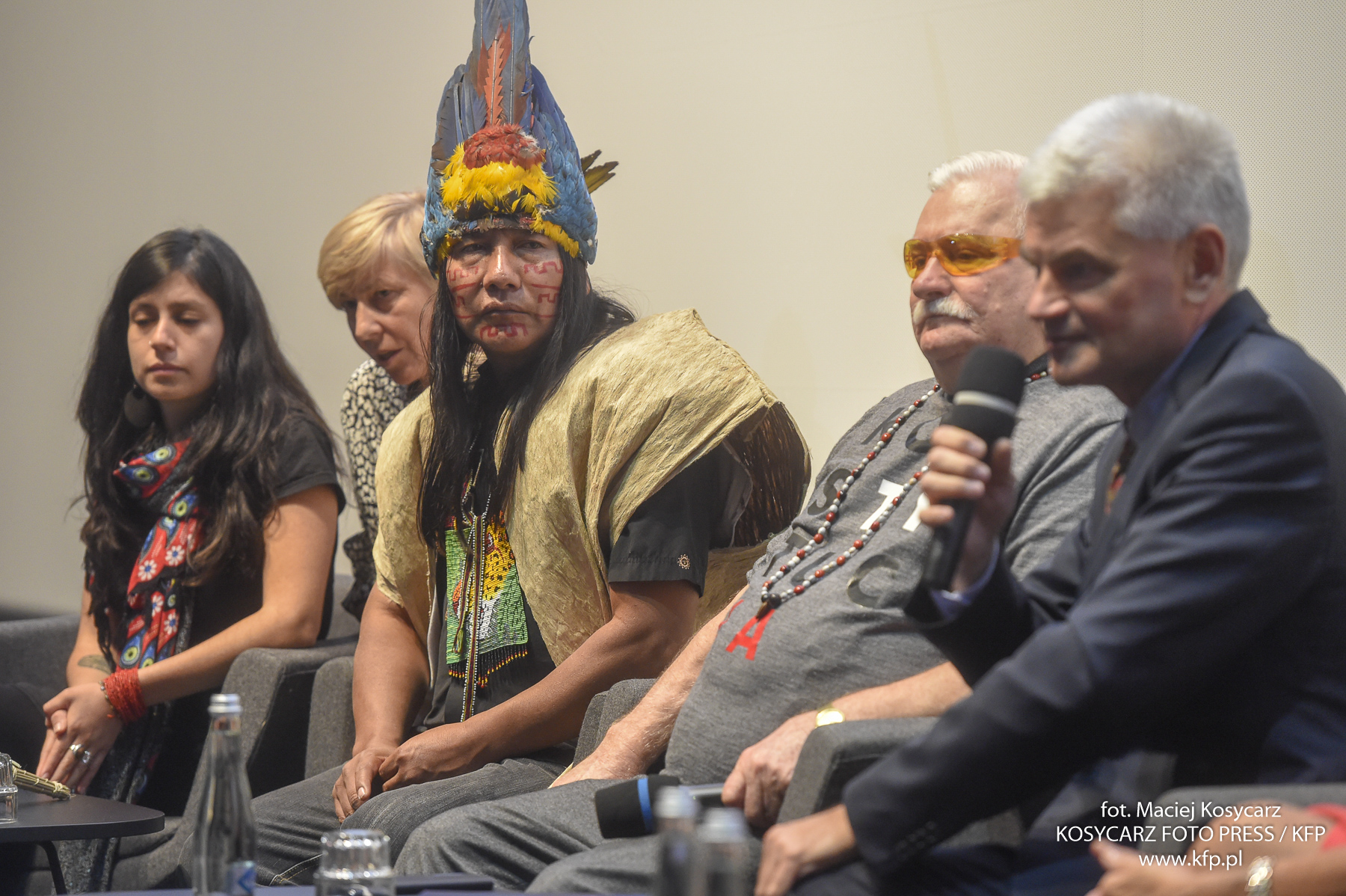 Goście specjalni, Antonella Calle i Manari Ushigua, w rozmowie z Lechem Wałęsą. Konferencję moderował Edwin Bendyk.